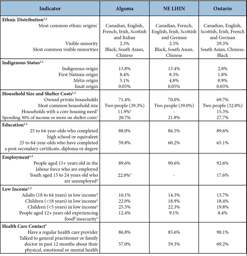 Health in Algoma communities can be influenced by ethnic distribution, Indigenous status, household size and costs, education, employment, income, and access to health care (APH, 2018). In Algoma, several of these indicators are notable when compared to Ontario as whole. This includes a higher number of Indigenous and Francophone community members and a higher percentage of residents with low income. Because Algoma is a diverse and widespread community, these population characteristics help underpin the importance of taking an equity-focused approach and emphasize the value of culturally appropriate care.