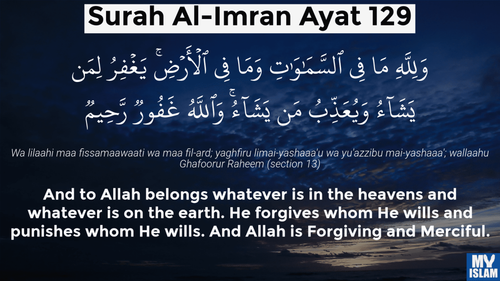 To Allah ˹alone˺ belongs whatever is in the heavens and whatever is on the earth. He forgives whoever He wills, and punishes whoever He wills. And Allah is All-Forgiving, Most Merciful. (surah Al Imran 3:129);