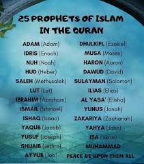 The 25 prophets mentioned by name in the Quran are Adam, Idris (Enoch), Nuh (Noah), Hud, Saleh, Ibrahim (Abraham), Lut (Lot), Ismail (Ishmael), Ishaq (Isaac), Yaqub (Jacob), Yusuf (Joseph), Ayyub (Job), Shu’ayb, Musa (Moses), Harun (Aaron), Dhul-Kifl (Ezekiel), Dawud (David), Sulayman (Solomon), Ilyas (Elijah), Al-Yasa (Elisha), Yunus (Jonah), Zakariya (Zechariah), Yahya (John), Isa (Jesus), and Muhammad. – Peace be upon them all;