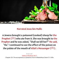 - Narated By Abu Huraira : When Khaibar was conquered, a roasted poisoned sheep was presented to the Prophets as a gift (by the Jews). The Prophet ordered, “Let all the Jews who have been here, be assembled before me.” The Jews were collected and the Prophet said (to them), “I am going to ask you a question. Will you tell the truth?” They said, “Yes.’ The Prophet asked, “Who is your father?” They replied, “So-and-so.” He said, “You have told a ie; your father is so-and-so.” They said, “You are right.” He siad, “Will you now tell me the truth, if I ask you about something?” They replied, “Yes, O AbuAl-Qasim; and if we should tell a lie, you can realize our lie as you have done regarding our father.” On that he asked, “Who are the people of the (Hell) Fire?” They said, “We shall remain in the (Hell) Fire for a short period, and after that you will replace us.” The Prophet said, “You may be cursed and humiliated in it! By Allah, we shall never replace you in it.” Then he asked, “Will you now tell me the truth if I ask you a question?” They said, “Yes, O Ab Li-AI-Qasim.” He asked, “Have you poisoned this sheep?” They said, “Yes.” He asked, “What made you do so?” They said, “We wanted to know if you were a liar in which case we would get rid of you, and if you are a prophet then the poison would not harm you.”