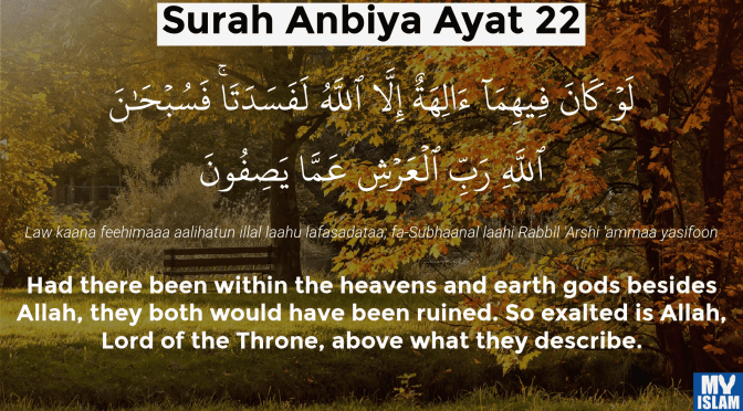 Ayah – Verse 22 – If (there) were in both of them gods besides Allah, surely they (would) have been ruined. So glorified (is) Allah, Lord (of) the Throne (above) what they attribute.
