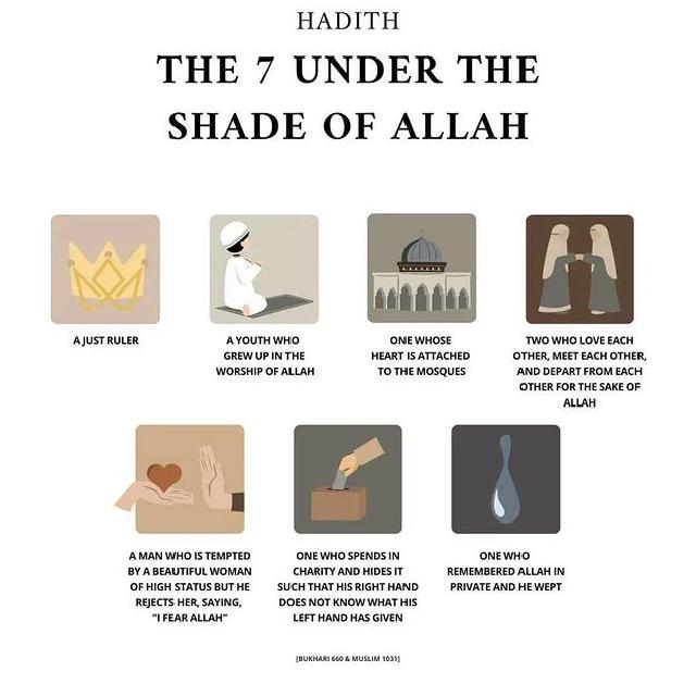 “There are seven whom Allah will shade in His Shade on the Day when there is no shade except His Shade: a Just ruler: a youth who grew up in the worship of Allah, the Mighty and Majestic; a man whose heart is attached to the mosques; two men who love each other for Allah’s sake, meeting for that and parting upon that; a man who is called by a woman of beauty and position (for illegal intercourse), but he says: ‘I fear Allah’; a man who gives in charity and hides it, such that his justify hand does not know that his right hand gives charity; and a man who remembered Allah in private and so his eyes shed tears.” (Bukhari and Muslim)